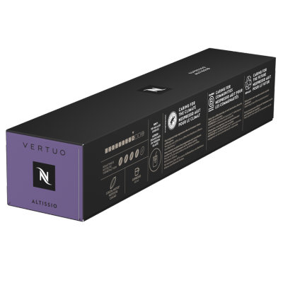 When Altissio walks in, you’ll notice. The South American Arabicas and a touch of Brazilian Robusta give it that full - bodied, bold espresso taste. We balanced these coffees out with a Costa Rican Arabica that adds its soft cereal note. These Arabica and Robusta coffees get an intense and short roast to bring out that full - bodied character. In royal robes, Altissio is a Vertuo espresso coffee cloaked in a thick, velvety crema - full of roasty notes and a soft and creamy cereal note