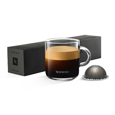 Why we love it: Vertuo Fortado is an Arabica and Robusta coffee blend in full force. We chose a naturally processed Robusta for its high-end quality and unmatched intensity and full body. If you’re tasting those cocoa and oak wood notes, that’s the washed Arabicas we blended with the Robusta. It’s a split roast - a long roast of the Robusta makes sure there’s no harshness and a darker long roast of the Arabicas beans develops its distinct aromatics. Here’s a strong character with full crema. With milk this coffee keeps its powerful character while enhancing the cocoa notes.