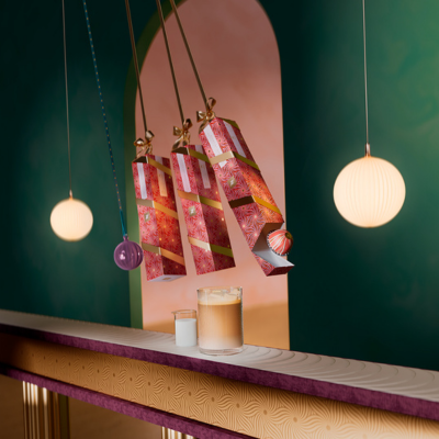 Šventinis malonumas, perteikiantis migdolus, kinrožę, raudonuosius vaisius ir karamelę, saldžiame kavos pagrinde.