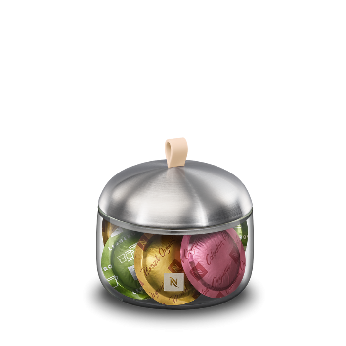 Pagamintas iš skaidraus stiklo, šis apvalus laikiklis, suteikia kapsulėms išskirtinumo.