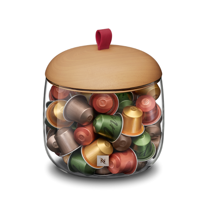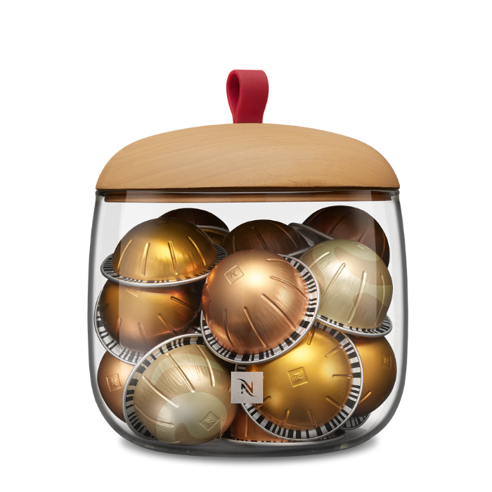 Pagamintas iš skaidraus stiklo, šis apvalus laikiklis, suteikia kapsulėms išskirtinumo.